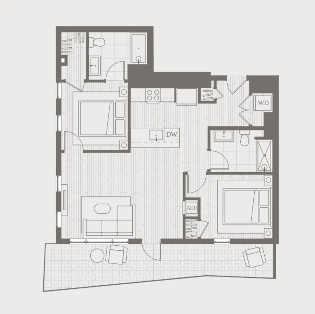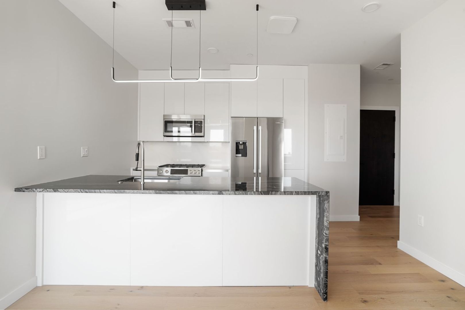 Each apartment type, ranging from studios to 3 bed residences, is designed to maximize space and light, providing a range of options to suit different needs and lifestyles. Each residence features high ceilings and wide windows, framing impressive city views and flooding the rooms with light. Designer kitchens equipped with top-tier appliances and waterfall islands offer both function and style. The living areas are designed to be both inviting and luxurious, providing serene atmospheres with expansive views. All apartments are pet-friendly!