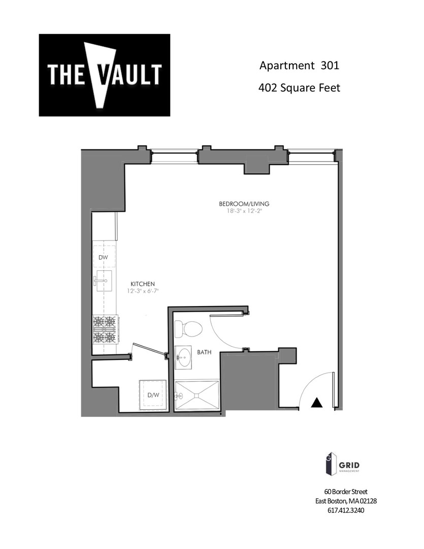 Unit 301 is a spacious studio has stainless steel appliances, custom cabinetry, granite countertops, energy efficient HVAC, and in-unit laundry.